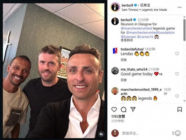 贝尔巴托夫写道:“在格拉斯哥参加曼联传奇赛,与老队友们重聚。”