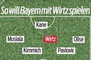 体育资讯05月14日讯 体育图片报预测了下赛季拜仁的阵容。拜仁计划让维尔茨担任10号位,并让穆西亚拉担任左边锋。在4231阵型之中,维尔茨和穆西亚拉能够在场上互换位置。