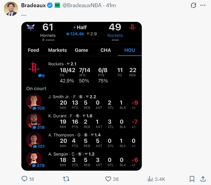 次节杜兰特的个人进攻也受到限制单节4中2拿到5分1助攻2抢断,半场拿到16分,小贾半场13分,球队核心申京半场18分钟只拿到3分,阿门半场也只拿到4分,双核状态低迷的情况下半场火箭也落后到两位数。