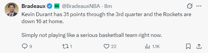 第三节的杜兰特已经竭尽全力,火箭的整体防守表现不佳,拼抢篮板球的积极性也不佳,杜兰特单节9中6爆砍15分1篮板1抢断分差还进一步被拉开,三节打完杜兰特31分钟拿到31分5抢断,这样的攻防表现都无法帮助球队缩小分差。