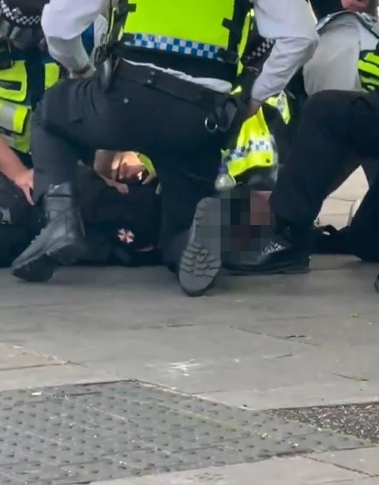 现场视频显示,这名戴着头套的少年被多名警员压制在地,一名警察摘下了他的黑色面罩,随后他被戴上手铐并带走。整个过程发生在大批切尔西球迷经过的区域,引发一阵恐慌。